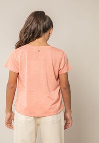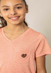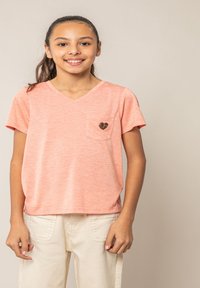 Fille souriante avec une longue queue de cheval, portant un t-shirt pêche avec un détail en forme de cœur, un pantalon large crème et des baskets orange et blanches, debout de manière détendue.