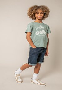 Enfant aux cheveux bouclés portant un t-shirt vert avec un motif de moto, un short en jean foncé retroussé, des chaussettes blanches et des baskets beiges, debout avec assurance.