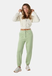 Femme portant un sweat à capuche court crème, pantalon de jogging vert clair avec cordon de serrage, et baskets blanches, debout les mains dans les poches.