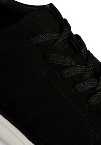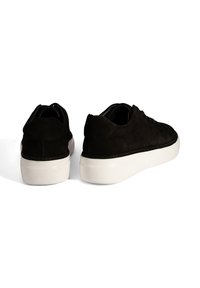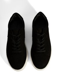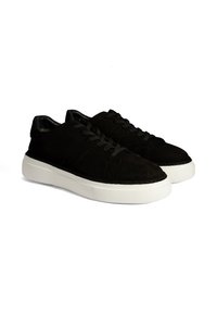 Baskets en suédine noire avec un bout rond, un laçage traditionnel et une semelle en caoutchouc blanche. Présentent une texture lisse et un style minimaliste.