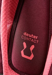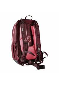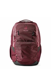 Sac à dos Deuter Cotogy rouge foncé avec plusieurs compartiments zippés, motif géométrique sur la poche avant et poches latérales.