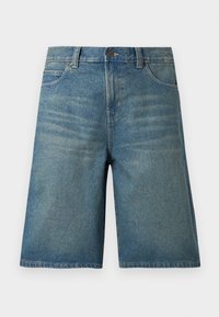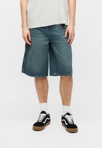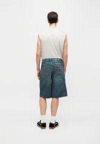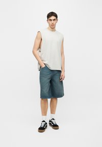 Jeune homme aux cheveux courts et foncés, portant un débardeur blanc et un short en jean bleu jusqu'aux genoux, debout avec les mains dans les poches.