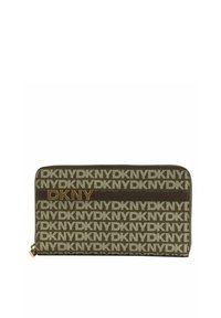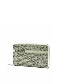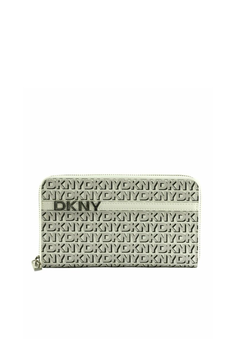Portefeuille zippé avec motif répétitif du logo DKNY en noir sur blanc, doté d'une bande horizontale en cuir blanc avec des lettres métalliques DKNY.