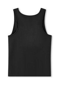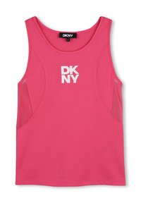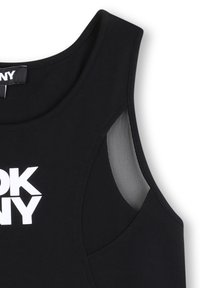 Débardeur sans manches noir en tissu lisse, avec un col rond, des panneaux latéraux en maille, et un logo blanc "DKNY" bien visible sur le devant.