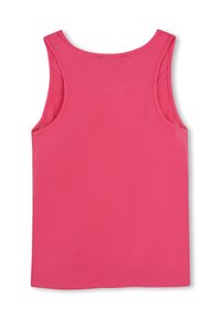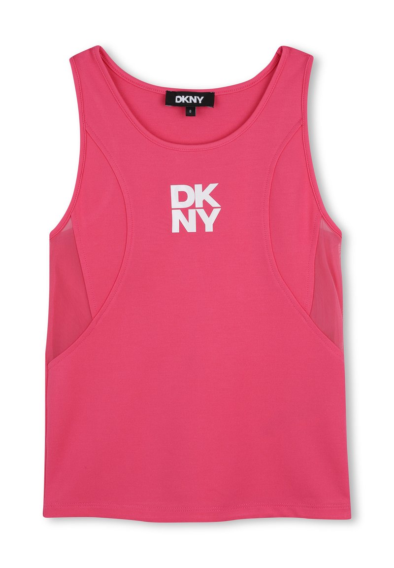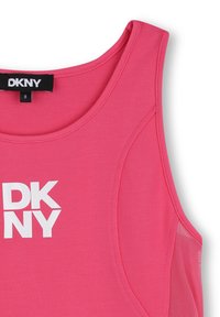 Haut rose sans manches en tissu extensible, avec un col rond et un logo imprimé blanc "DKNY" sur le devant. Texture lisse et coupe ajustée.