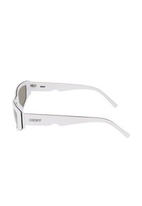 Lunettes de soleil blanches angulaires avec verres gris et logo DKNY sur les branches, présentées en angle pour montrer l'avant et le côté.