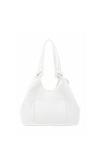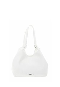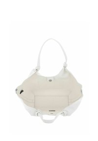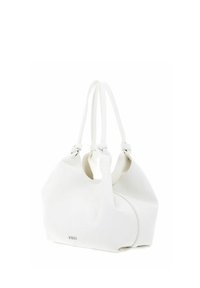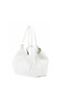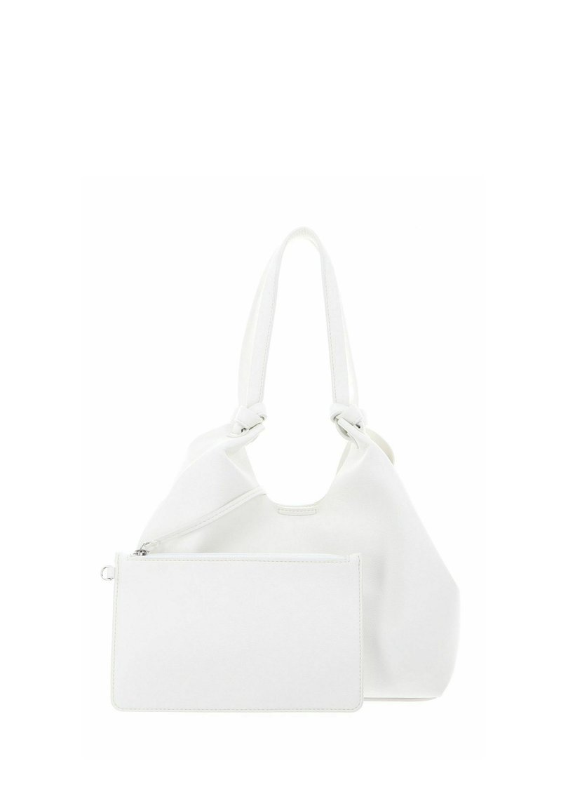 Sac à bandoulière en cuir blanc avec des anses nouées et une pochette rectangulaire assortie amovible à fermeture éclair à l'avant.