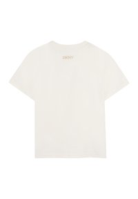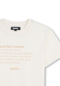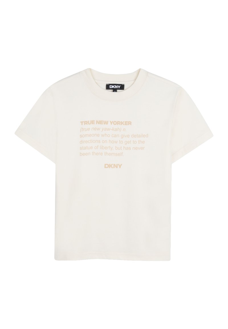 T-shirt DKNY couleur crème à manches courtes. Présente une impression avant en brun clair définissant "True New Yorker" avec une description humoristique.