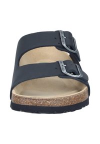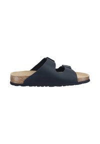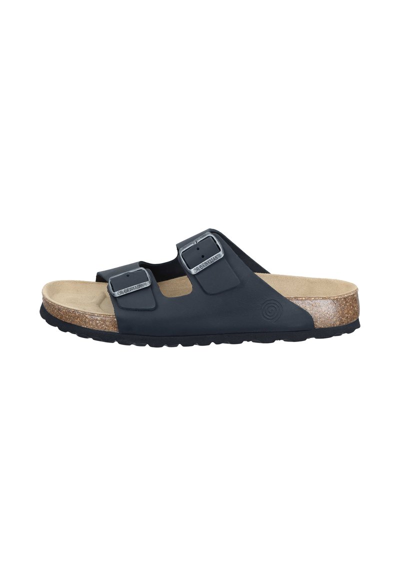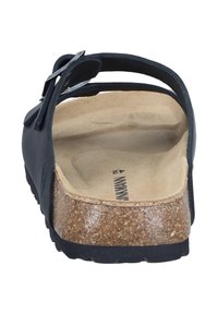 Sandales noires à enfiler avec deux boucles argentées réglables, semelle intérieure en liège et semelle extérieure en caoutchouc noir texturé. Surface lisse avec un design minimaliste.