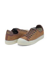 Basket basse avec dessus tissé marron et beige, lacets marron et semelle en caoutchouc blanche, montrée en profil gauche sur fond blanc.