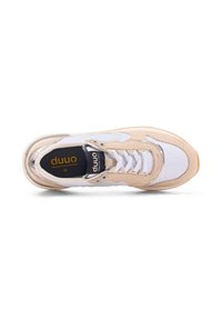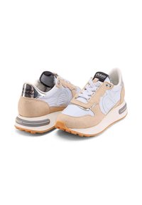 Baskets basses avec empiècements en daim beige, panneaux en tissu blanc, semelle en caoutchouc et détails gris, vues de l'extérieur.