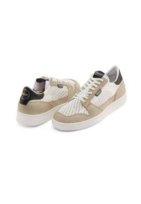 Baskets basses avec empiècements en suède beige, panneaux en mesh blanc, lacets blancs, semelle blanche et languette de talon noire avec marquage doré.