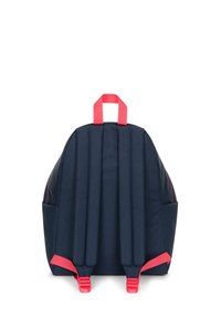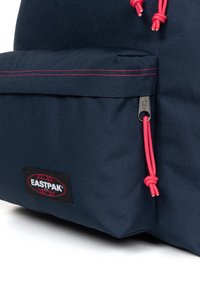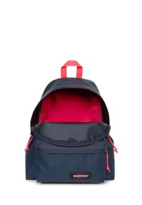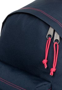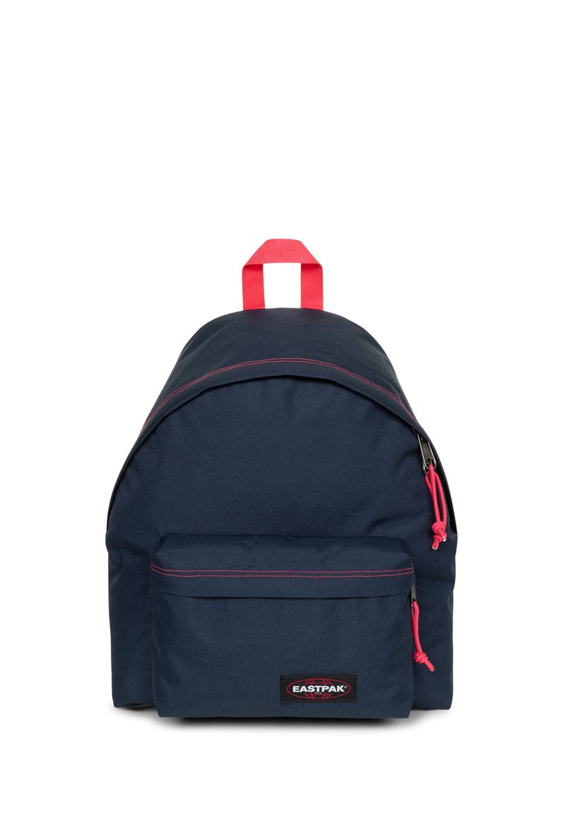 Sac à dos en tissu bleu marine avec une forme arrondie, des accents de fermeture éclair rouges, une poche avant et une poignée supérieure pour le transport. Comprend un patch avec logo.