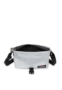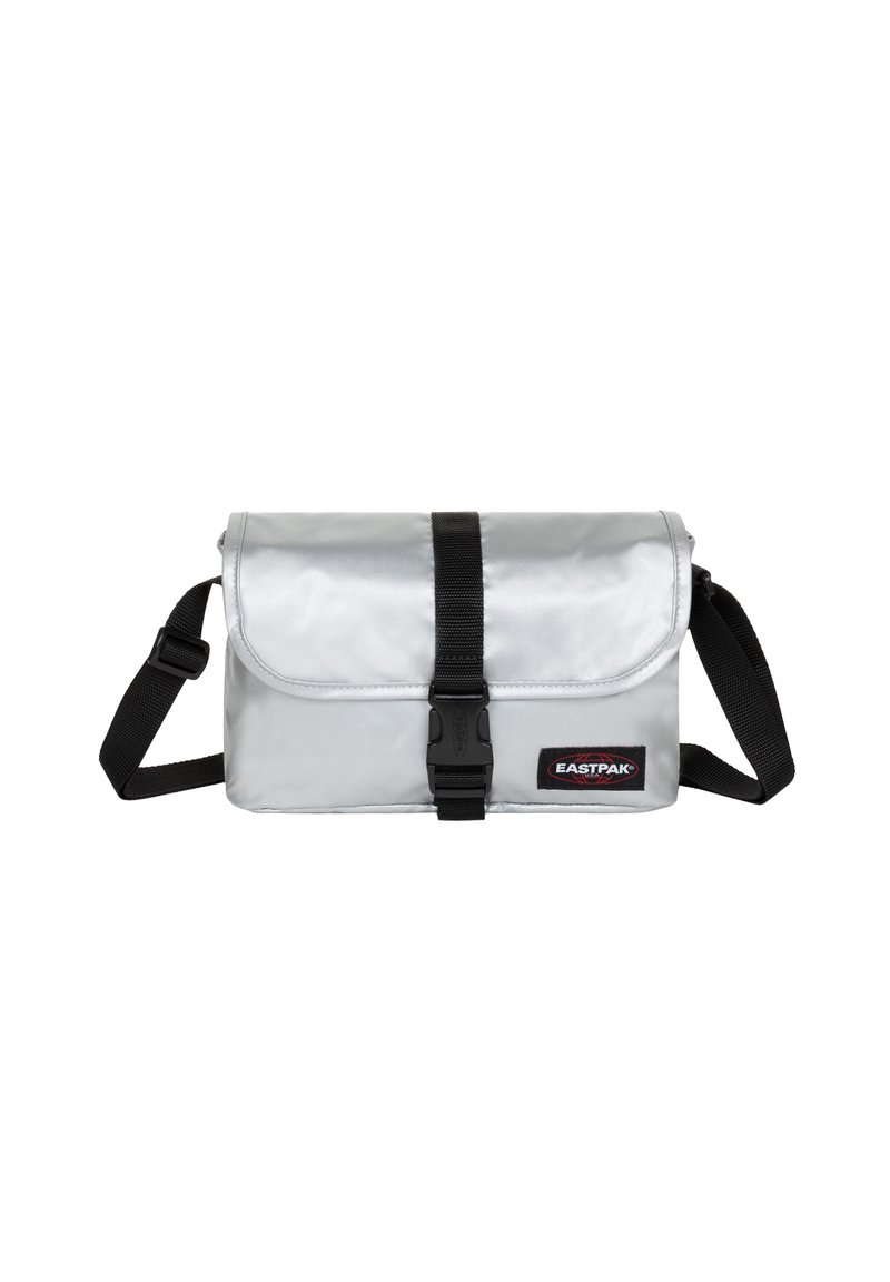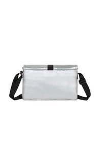 Sac messager argenté avec fermeture à rabat, doté d'une sangle noire et d'une boucle. Fabriqué en matériau lisse et durable avec une étiquette de marque.
