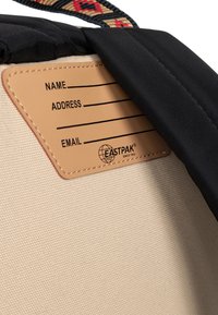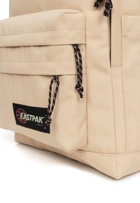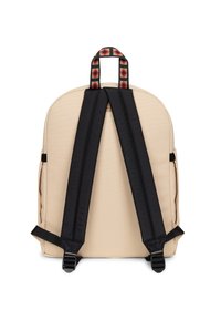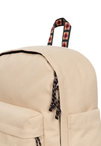 Sac à dos beige avec une finition textile lisse, comportant une poche avant, des bretelles réglables et une poignée supérieure à motif avec des accents rouges.