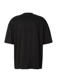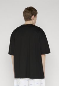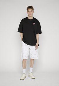Jeune homme portant un T-shirt noir oversize avec un petit logo "Ecko" rouge et blanc sur la poitrine, et un short blanc avec le texte bleu "ecko unltd".