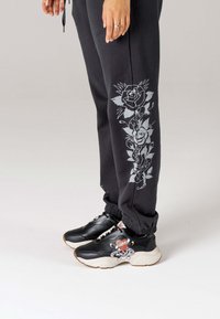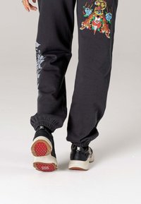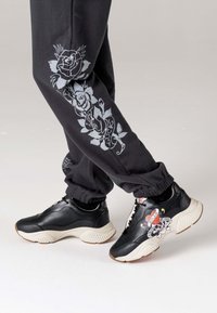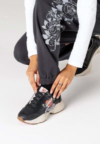 Soyez audacieux ou restez chez vous. La basket urbaine chunky Base-runner attire l'attention en similicuir noir et présente une impression numérique vive de l'illustration du tatouage Love Kills Slowly d'Ed Hardy.