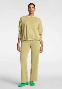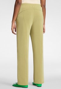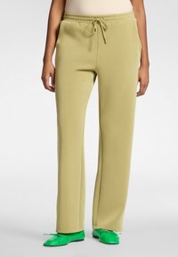 Pantalon de survêtement vert clair avec une taille élastique et un cordon de serrage, présentant une coupe décontractée, des ourlets resserrés et une texture de tissu lisse.