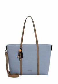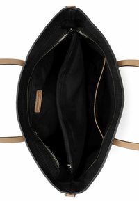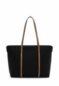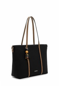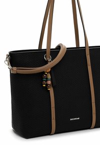 Sac fourre-tout noir texturé avec poignées marron et bandoulière amovible, décoré d'un porte-clés orné de perles en bois.