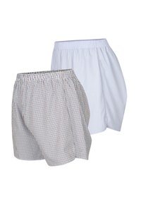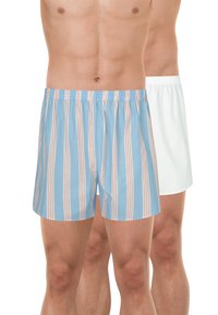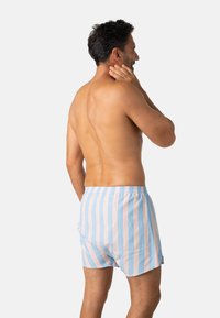 Homme à la peau mate, cheveux courts foncés, barbe, debout torse nu portant un boxer bleu clair avec des rayures verticales orange et blanches.
