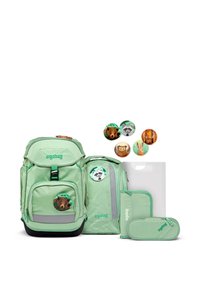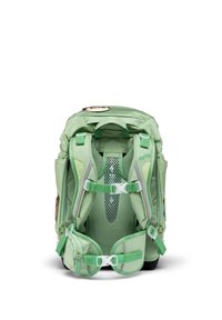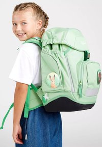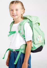 Jeune fille aux cheveux tressés souriant et portant un grand sac à dos vert clair orné de patches lapin et ours.