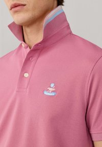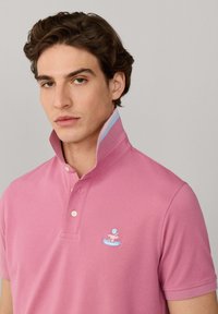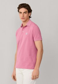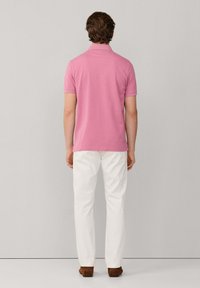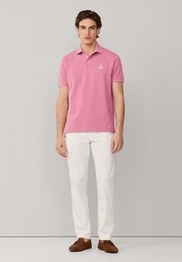 Homme portant un polo à manches courtes rose avec un petit logo brodé sur le côté gauche de la poitrine et un pantalon blanc, debout devant un fond uni.