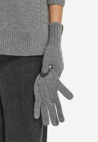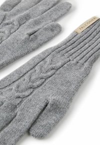 Gants tricotés gris en matériau doux avec des poignets côtelés et une étiquette au poignet. Les gants ont un design ajusté et épuré.