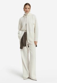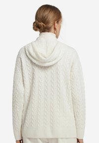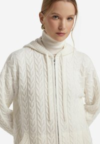 Haut à capuche blanc en tricot torsadé avec une fermeture éclair, des poches latérales et des cordons de serrage. Ourlet et poignets côtelés, avec un motif de tricot texturé.