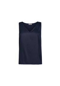 Haut sans manches en satin noir avec un décolleté en V profond, texture lisse et bords nets, conçu pour une silhouette ajustée.