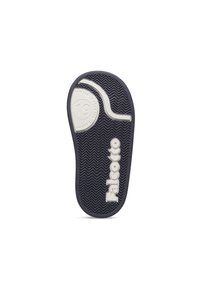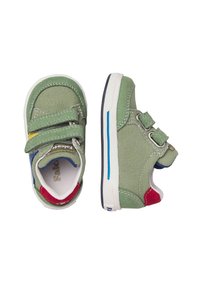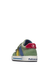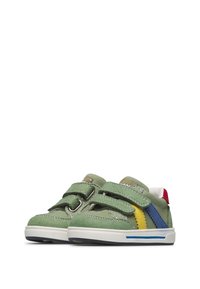 Baskets vertes pour enfants avec des bandes latérales jaunes et bleues, un détail rouge au talon, deux bandes Velcro et une semelle en caoutchouc blanche avec un accent bleu.
