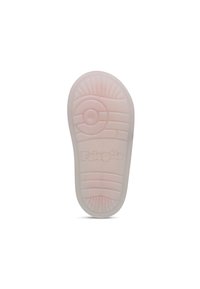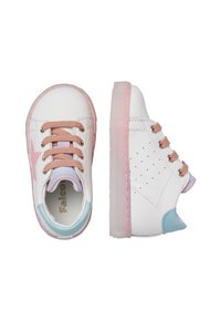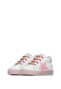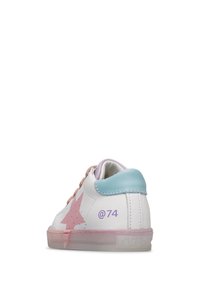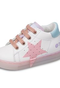 Baskets blanches pour enfant avec une étoile rose sur le côté, des lacets roses, une bride de talon bleu clair et une semelle rose translucide, vue de côté.