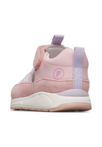 Sandale fermée rose pour enfant avec brides réglables, dessus en suède et tissu, semelle rembourrée et languette à l'arrière du talon.