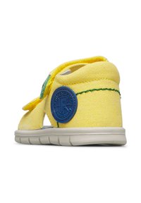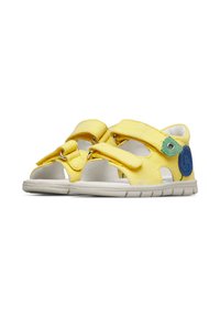 Sandale jaune pour tout-petit avec deux sangles ajustables, des coutures vertes, un badge circulaire bleu et une semelle blanche flexible.