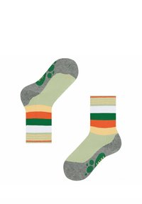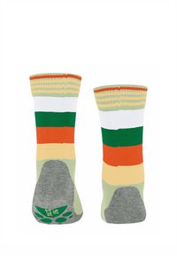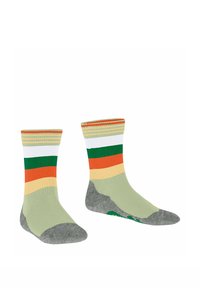 Paire de chaussettes mi-mollet avec des rayures vertes, orange, jaunes, blanches et grises, et des zones renforcées au niveau des orteils et des talons.