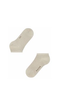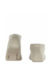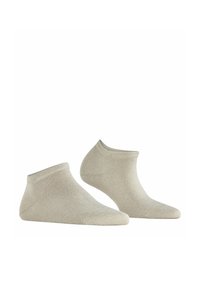 Paire de chaussettes beiges à la cheville, une posée à plat et l'autre debout sur un fond blanc.