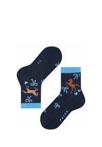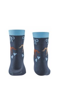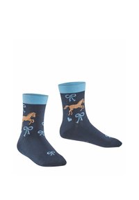 Chaussettes bleu marine avec des bords bleu clair, ornées d'un cheval orange, de nœuds bleu clair et de motifs en forme de cœur.