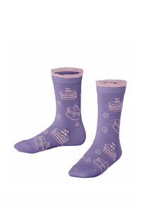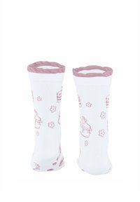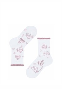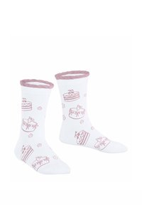 Chaussettes blanches montantes avec bordure rose, décorées d'illustrations roses de différents gâteaux et de petites fleurs.