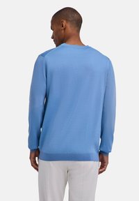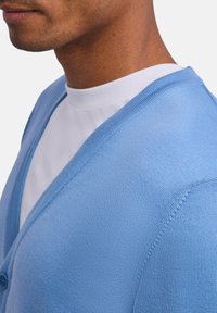 Homme portant un cardigan bleu clair boutonné sur une chemise blanche et un pantalon clair, debout avec une main dans la poche.