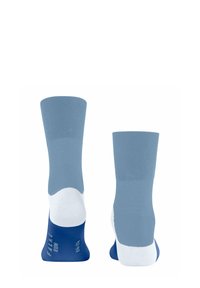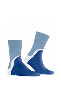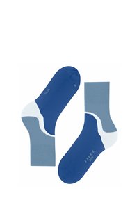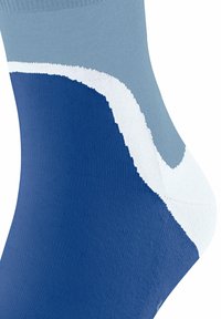 Paire de chaussettes mi-mollet en bleu avec des bordures bleu clair et des accents courbes blancs autour des talons, présentées côte à côte sur un fond blanc.
