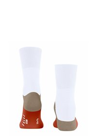 Paire de chaussettes montantes avec le haut blanc, le pied et le talon couleur rouille, et un accent beige formant une courbe entre le talon et le dessus.