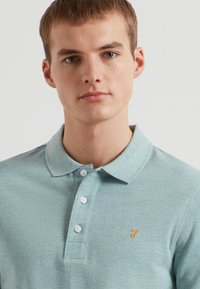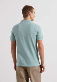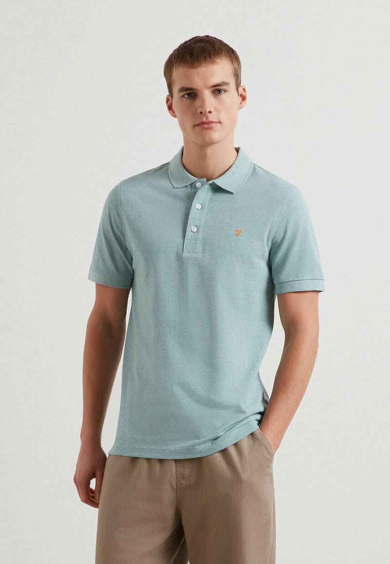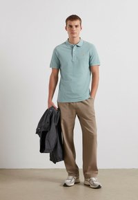 Jeune homme aux cheveux courts portant un polo à manches courtes bleu clair et un pantalon beige, debout avec une main dans la poche.