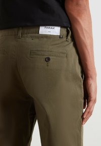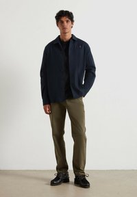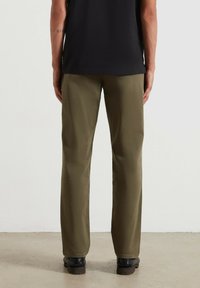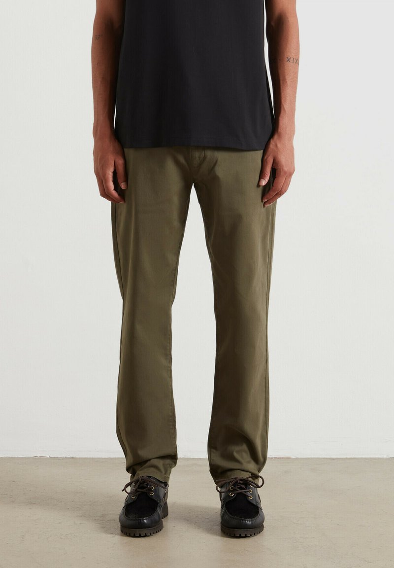 Personne portant un pantalon droit vert olive, des chaussures noires à lacets et une chemise noire, debout sur un sol clair contre un mur blanc.