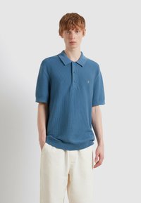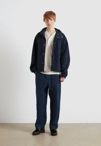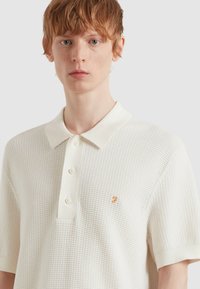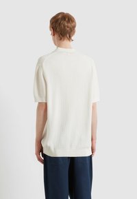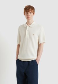 Jeune homme aux cheveux roux portant un polo blanc texturé à manches courtes et un pantalon bleu marine foncé, debout les mains dans les poches.