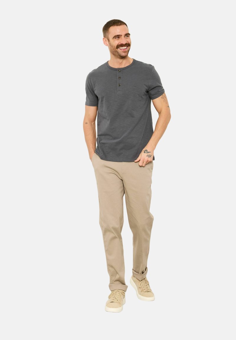 Homme souriant, debout avec les mains dans les poches d'un pantalon beige, portant une chemise à manches courtes gris foncé boutonnée et des baskets beiges sur fond blanc.