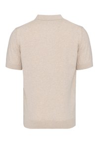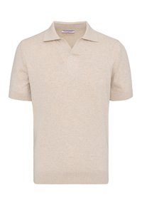 Deux polos à manches courtes, un beige devant et un bleu marine derrière, tous deux avec col et ouverture en V.
