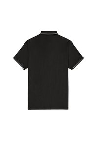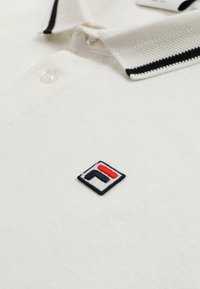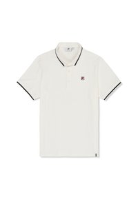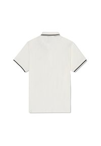 Polo blanc avec col rayé noir et blanc, boutons transparents, et petit logo carré brodé en noir, blanc et rouge sur la poitrine.