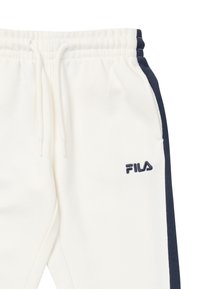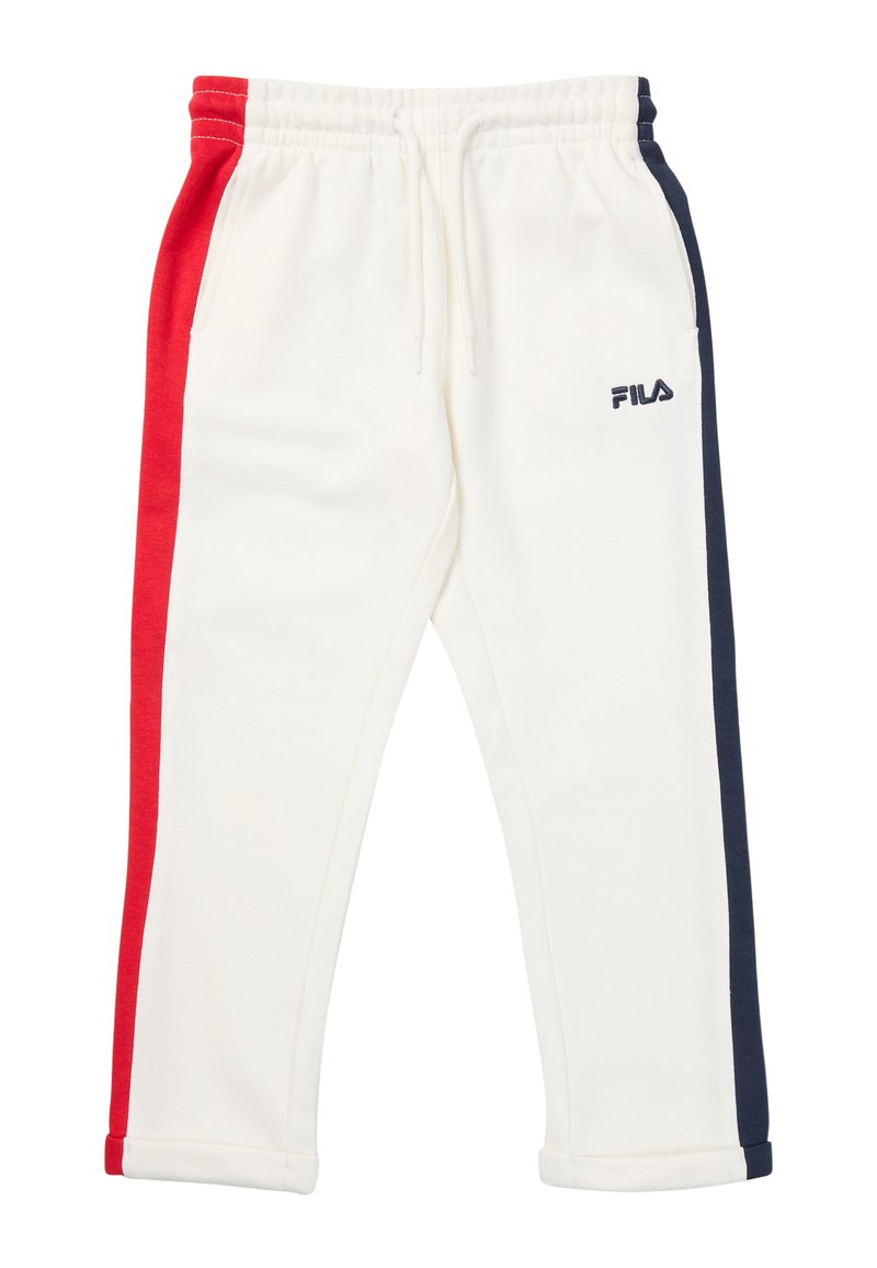 Pantalon de survêtement blanc FILA avec taille élastique, bande rouge sur la jambe gauche et bande bleu marine sur la jambe droite.