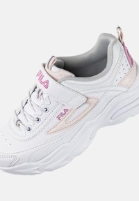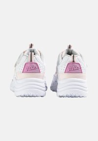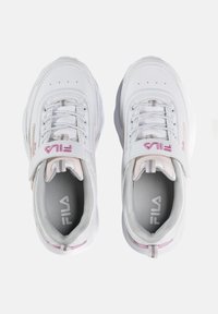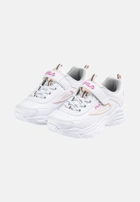 Baskets blanches FILA à semelle épaisse, accents roses, devant lacé et bride Velcro, vues de l'extérieur sur fond blanc.