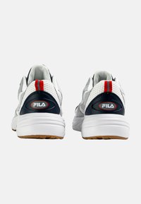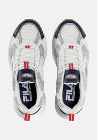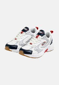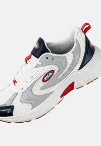 Chaussure de sport blanche avec tige en mesh, accents bleu marine, détails rouges et semelle extérieure en caoutchouc. Comprend une fermeture à lacets et un col rembourré pour le soutien.