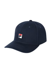 Casquette de baseball bleu marine avec une visière courbée et des panneaux cousus, ornée d'un petit patch logo rectangulaire en rouge, blanc et bleu sur le devant.